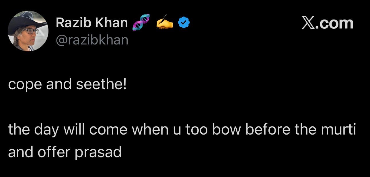 Prasad is a religious offering of food placed at a shrine of a deity. This word is slowly leaching into English. For example, here’s Razib doing a lil ragebaiting: