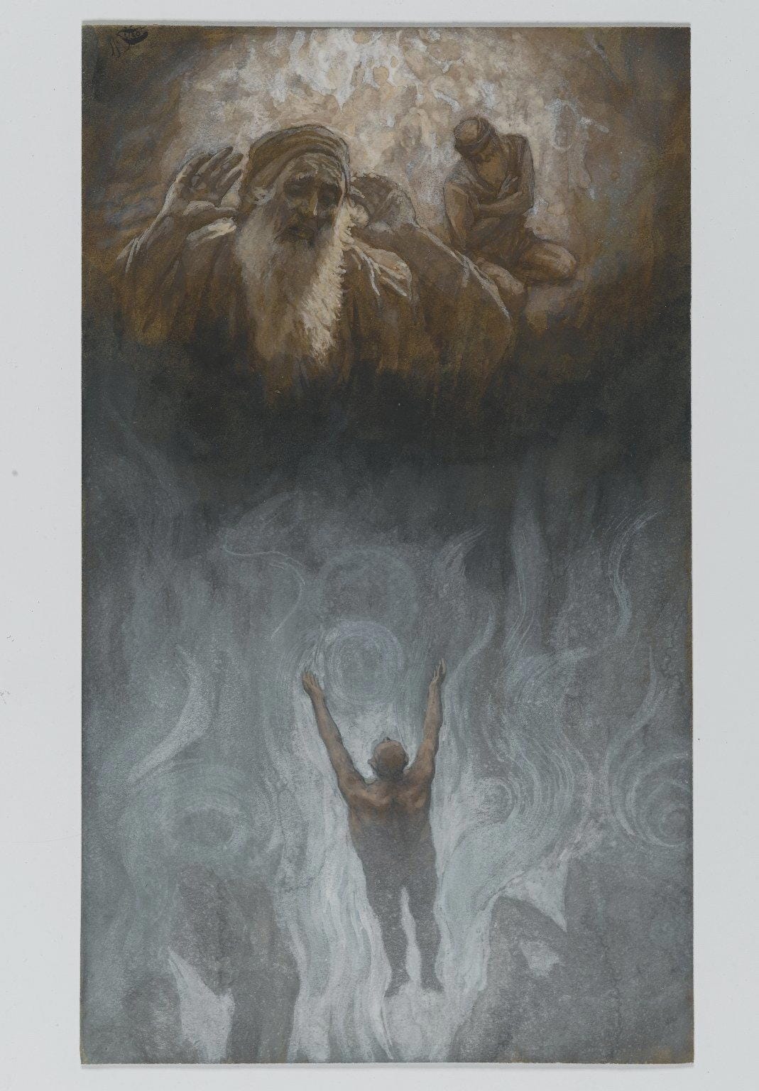 So the rich man begs that Lazarus be sent from heaven to relieve him of his suffering, but Abraham will not and cannot comply because the “great gulf” between those in heaven and those in hell is unfordable. Then the rich man man asks that Lazarus be resurrected and sent to his brothers to induce them to repent, but Abraham will not do this, reasoning that it would be pointless since they already had exposure to the teachings of Moses and the other prophets and would have already repented if they could.
